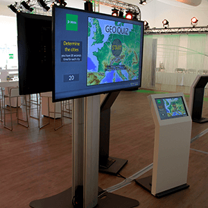 - Präsentieren Sie das Geo-Quiz auf einem 22 Zoll Touch-Terminal oder auf einem 55 Toll Touch-Kiosk